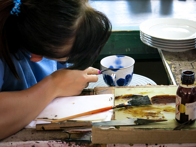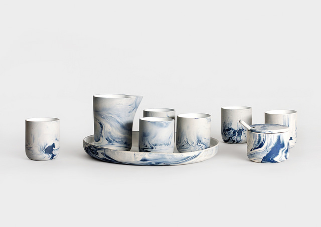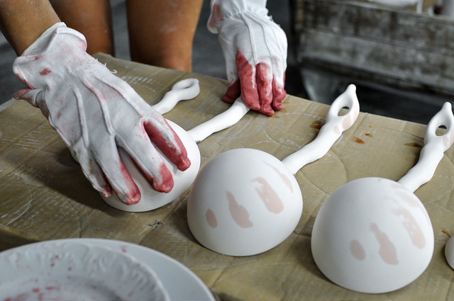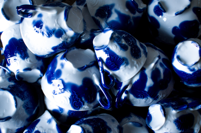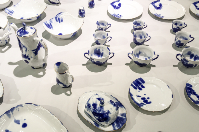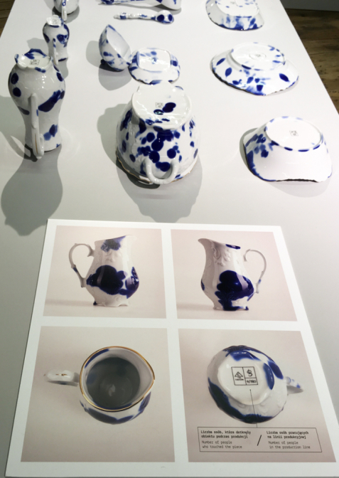 塩化コバルトに浸された手袋を着用した労働者によって工場生産ラインで生産された。彼らが接触した痕跡を目にすることで工業生産におけるなかの「人間の要素」の役割が明らかになり、「人間の仕事」の結果であるということ、そしてこの触れ合いが製造プロセス全体の一部であることを視覚的に示している。白く、滑らかに輝くポーセリン陶器は完璧な清潔さを呼び起こさせるもの。指やリップの痕跡があれば、私たちはすぐさま拭き取りたくなるし、通常ならば使っている食器が何回誰かの手にふれたとか数えたくはないはず。ポーセリンの工場生産は社会的にも関心度が低いなか、ポーセリン工場の人々をリスペクトした企画はとても印象に残った。
