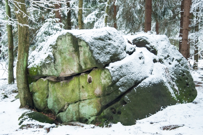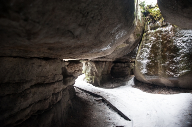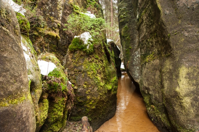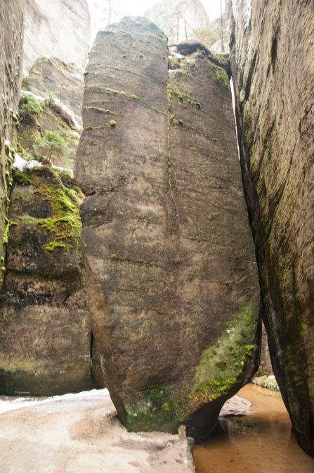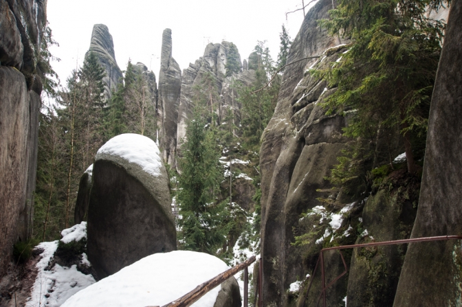 この奇岩に魅了されたなら、国境を超えてチェコ北部のボヘミア地方トゥルノフ(Turnov)のロック・シティへ。(車で約30分ほど)ここは奇岩が広がる地域で、中でも有名なアドルシュパフ=テプリツェ奇岩群がおすすめ。一足踏み入れると山に囲まれた美しく凍った湖、そのほとりの奥に進むと今までみたことのない景観が現れます。エリア内はハイキング・コースになっていて普通に歩いて約1時間半ほどでまわることができます。巨岩に囲まれながら歩いているとダイナミックなおとぎの世界を歩いているような感覚に、そして時間を忘れて歩くうちに次第に忘れられない思い出のひとつに。